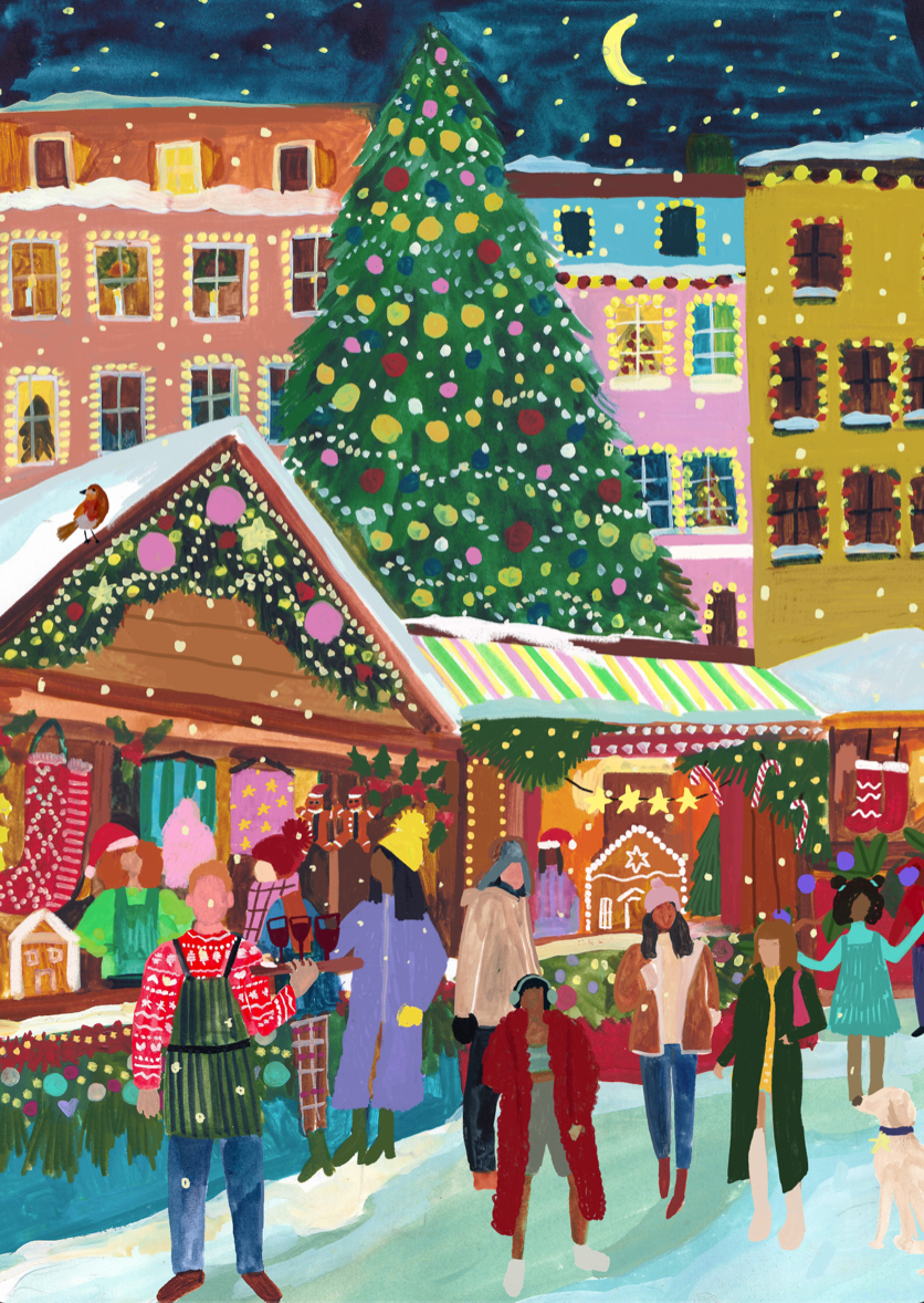 A cozy winter market comes to life in this hand painted scene, filled with glowing lights, snow-covered stalls, and the quiet joy of the season. Hebe Studio prints are anything...